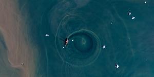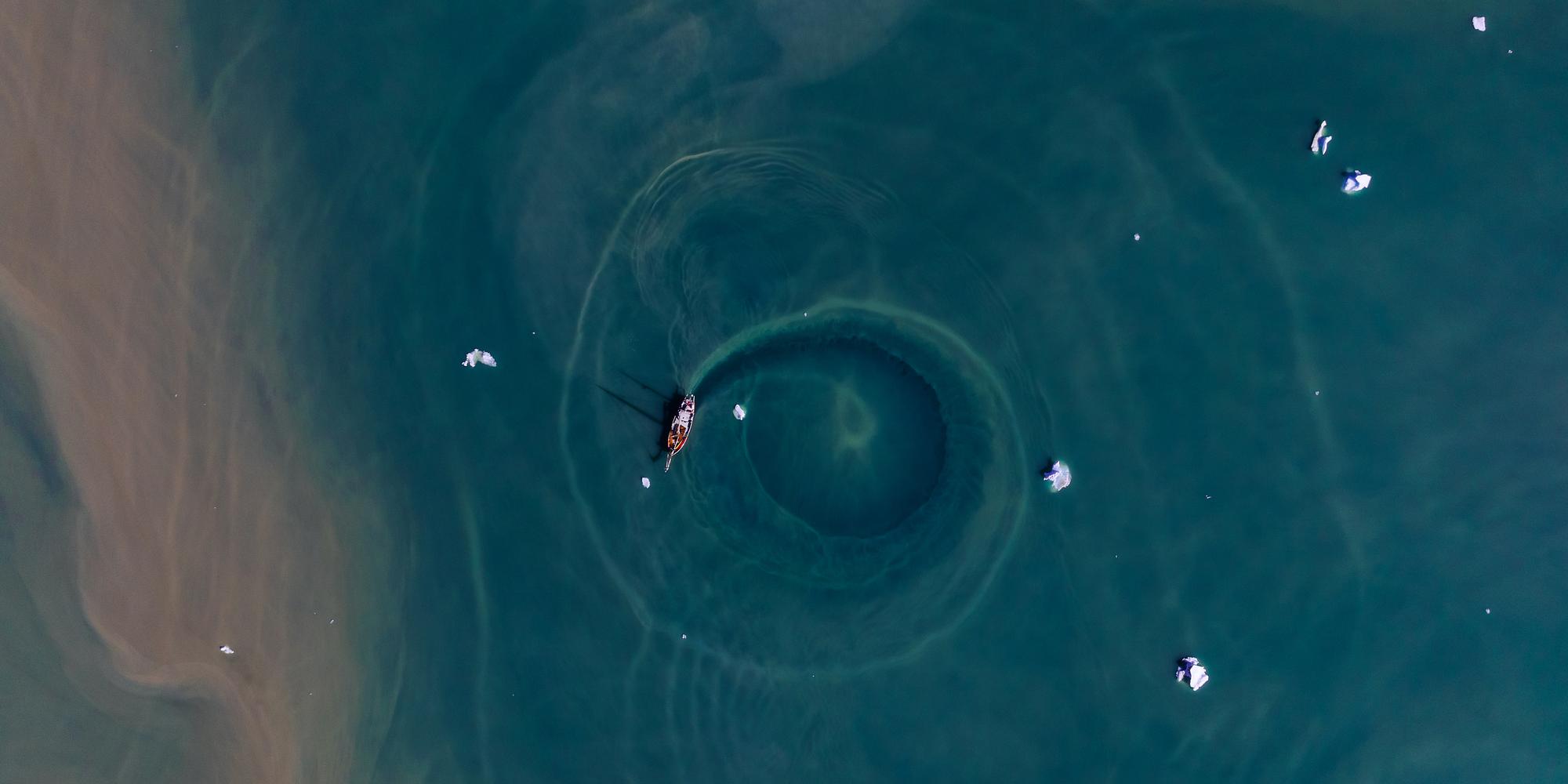 This aerial photo features a lone sailboat encircled by swirling currents in Greenland’s Arctic waters. The natural patterns and icy surroundings create a mesmerizing and dynamic composition, perfect for lovers of nautical and Arctic photography.