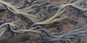 This aerial photograph captures the intricate patterns of a glacial river weaving through the Icelandic landscape. The dynamic flow and earthy tones create a mesmerizing abstract design, perfect for lovers of nature and fine art photography.