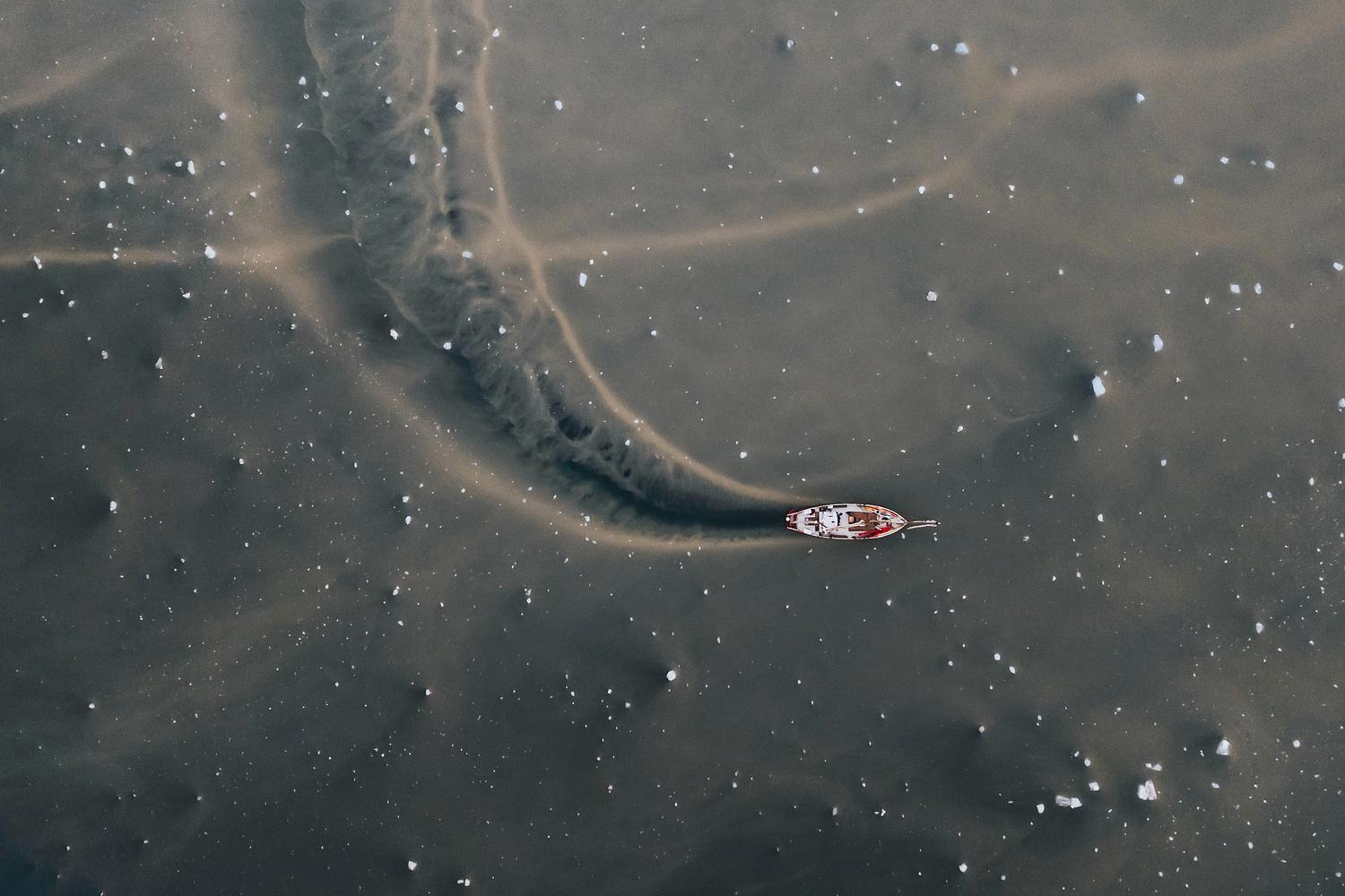 This aerial photograph captures a lone sailboat navigating icy Arctic waters in East Greenland, leaving a striking trail through the glacial silt and sediment-rich currents. The contrast of the boat against the textured waters highlights the serene yet dynamic nature of the Arctic. Ideal for lovers of nautical and Arctic landscape photography.