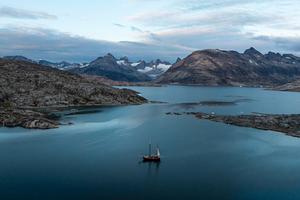 This captivating photo showcases a lone sailboat surrounded by the rugged fjords and tranquil waters of East Greenland. With towering peaks in the background and soft evening light, it captures the essence of Arctic serenity. Perfect for lovers of nature and seascape photography.