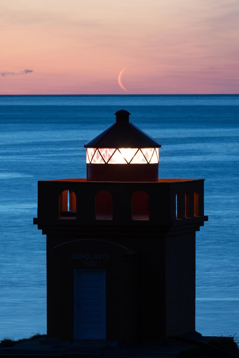 A serene lighthouse stands illuminated against the soft hues of the Westfjords sunset, with a crescent moon rising above the calm sea. This photo beautifully captures the tranquility and charm of Iceland’s coastal landscapes. Perfect for those who love minimalist and coastal photography.