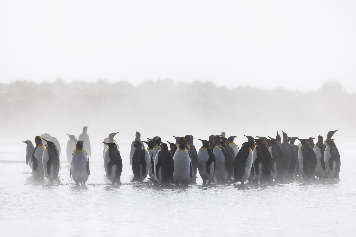 A remarkable image of King Penguins standing together in the misty waters of South Georgia Island. This photo captures the elegance and communal spirit of these iconic Antarctic birds in their natural habitat. Perfect for wildlife and polar photography enthusiasts.
