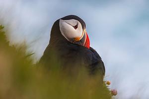 This intimate portrait captures the serene beauty of a puffin in the Westfjords of Iceland. With its vibrant beak and soft feathers, this photo showcases one of Iceland's most beloved seabirds in its natural habitat. A perfect addition for nature and wildlife photography enthusiasts.